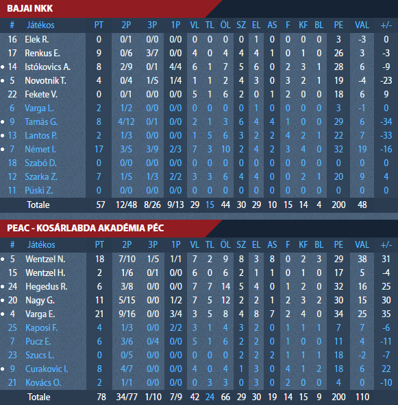 PEAC-KA: Varga 21, Wentzel N. 18/3, Hegedűs 6, I. Curakovic 8, Nagy 11. Csere: Kovács O. 2, Pucz 6, Kaposi 4, Wentzel H. 2, Szücs L. -.